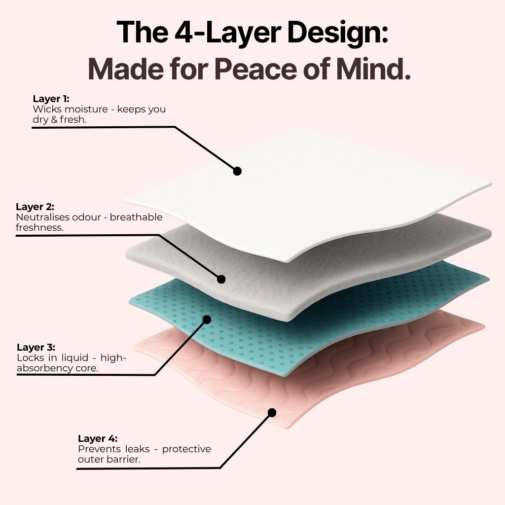 Our underwear is designed with an advanced multi-layer absorbent core that absorbs your flow, wicks away moisture, controls odour, and helps prevent leaks - keeping you dry, fresh, and comfortable all day.